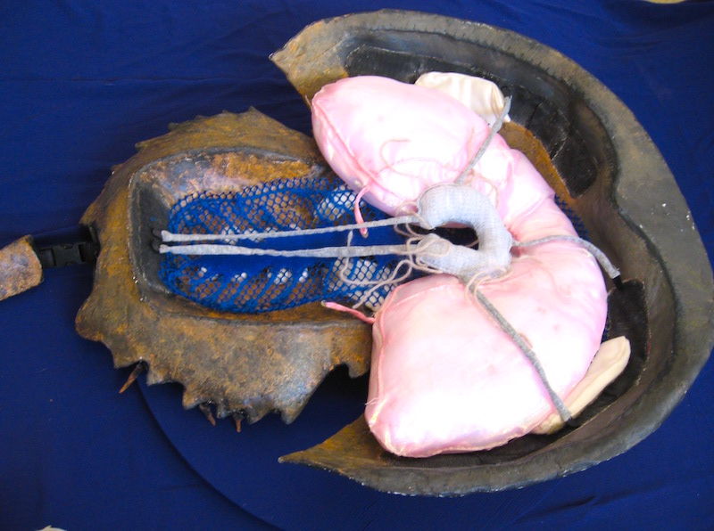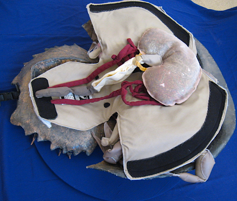 Our Horseshoe Crab Model Limulus polyphemus is a rich olive brown and features a hard epoxy carapace, cephalothorax and a telson (or tail) which is attached with a quick release buckle for easy transport. It is about 2 and half foot around by about 4 feet long with a heavy duty carrying case, vinyl claws, feathery gills and soft sculpture internal organs. Horseshoe crabs have a complicated circulatory system with a long tubular heart, muscles, gills, digestive gland, crop, gonads and a brain wrapped around their mouth.