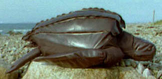 Leatherback facts: Largest of all sea turtles, the Leatherback Dermochelys coriacea can grow to be eight feet long. Unlike other sea turtles it does not have a hard shell but a ridged, leathery hide instead. The Leatherback can travel great distances from tropical to temperate water following its’ favorite food- drifting jellyfish.